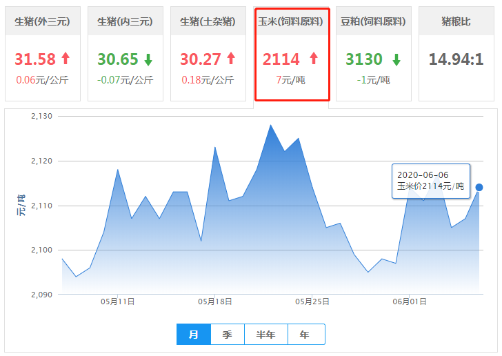 2020年06月06日,今日全国玉米均价为2114元/吨,报价较昨日上涨7元/吨。