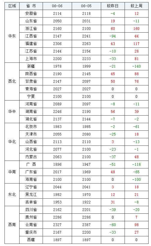 玉米均价(饲料原料)后十:广西壮族自治区1896元/吨、西藏自治区1897元/吨、吉林省1953元/吨、新疆维吾尔自治区1987元/吨、黑龙江省1982元/吨、北京市1983元/吨、广东省2017元/吨、青海省2027元/吨、辽宁省2044元/吨、山东省2050元/吨;