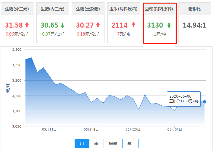 豆粕均价(饲料原料)前十:新疆维吾尔自治区3668元/吨、上海市3350元/吨、云南省3293元/吨、江苏省3280元/吨、江西省3260元/吨、四川省3251元/吨、甘肃省3229元/吨、湖北省3205元/吨、重庆市3203元/吨、贵州省3200元/吨;