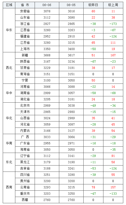 豆粕均价(饲料原料)后十:西藏自治区2760元/吨、浙江省2827元/吨、福建省2952元/吨、广东省2995元/吨、天津市2965元/吨、北京市2989元/吨、湖南省2999元/吨、山西省3024元/吨、广西壮族自治区3000元/吨、海南省3050元/吨。