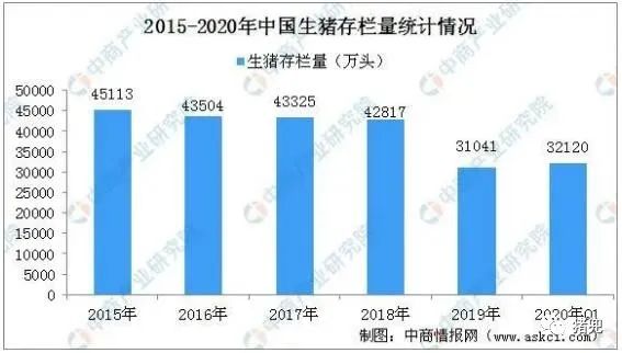 近年来,随着对生猪养殖的环保要求越发严格,中小散户退出生猪养殖,加上生猪价格的波动性和周期性的影响,我国生猪存栏量总体处于下降的趋势,已由2012年年末的48030万头减至2019年年末的31041万头。截至2020年一季度末,全国生猪存栏32120万头,较去年四季度末增长3.5%,能繁殖母猪存栏3381万头,增长9.8%。
