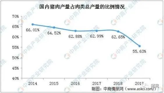 2014—2018年,国内肉类产品的生产结构中,猪肉产量占比均超过60%,超过牛肉、羊肉和其他肉类的总和,反映猪肉在我国食品消费中的重要地位,国内市场对猪肉存在巨大的市场需求。2019年,受环保政策、规模化养殖趋势、“非洲猪瘟”等因素叠加影响,生猪出栏量下降,进而导致猪肉产量也出现较大幅度的下降。2019年全年猪肉产量4255万吨,同比下降21.26%,猪肉产量占肉类总产量的比例下降至55.63%。