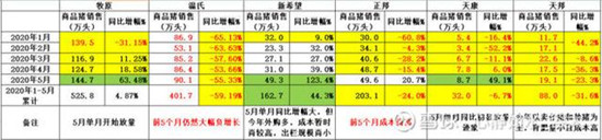 不幸的是,一直到2020年5月,从各上市公司的月报看,仍然没有几家公司从数据上能体现出部分投资者预期中的成长性(还没有从数据上呈现出来),除了基数低的新希望,表现最好的牧原也仅仅只是5月单月的出栏初步出现的高成长的端倪,各方面猪专家们预期的成长仍然停留在预期和测算中,1-5月的个人关注的几家主要猪公司的出栏情况见下表: