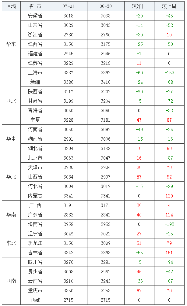 豆粕均价(饲料原料)后十:西藏自治区2715元/吨、浙江省2730元/吨、广东省2882元/吨、天津市2930元/吨、福建省2945元/吨、海南省2958元/吨、湖南省2991元/吨、河北省3004元/吨、贵州省3008元/吨、安徽省3018元/吨。