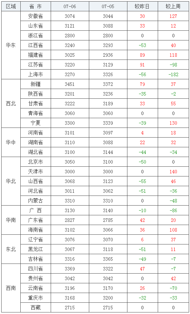 豆粕均价(饲料原料)后十:西藏自治区2715元/吨、浙江省2800元/吨、广东省2727元/吨、天津市3000元/吨、河北省3011元/吨、福建省3025元/吨、贵州省3042元/吨、北京市3050元/吨、青海省3060元/吨、黑龙江省3067元/吨。