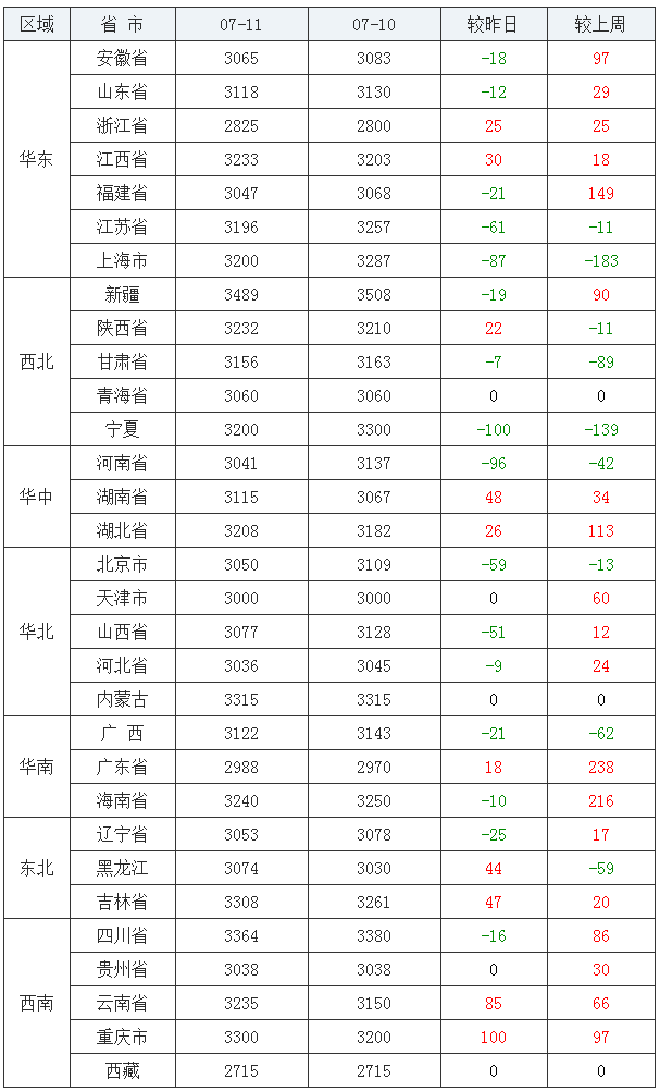 豆粕均价(饲料原料)后十:西藏自治区2715元/吨、浙江省2825元/吨、广东省2988元/吨、天津市3000元/吨、河北省3036元/吨、贵州省3038元/吨、河南省3041元/吨、福建省3047元/吨、北京市3050元/吨、辽宁省3053元/吨。