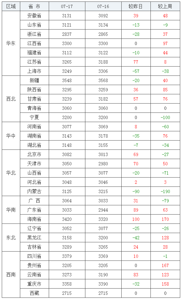 豆粕均价(饲料原料)前十:新疆维吾尔自治区3548元/吨、海南省3420元/吨、四川省3379元/吨、重庆市3358元/吨、江西省3300元/吨、陕西省3295元/吨、吉林省3289元/吨、云南省3273元/吨、江苏省3265元/吨、上海市3249元/吨;