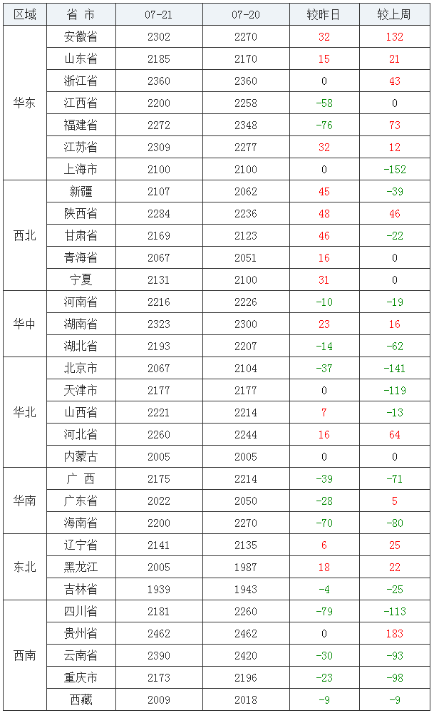 玉米均价(饲料原料)11-20名:河南省2216元/吨、海南省2200元/吨、江西省2200元/吨、湖北省2193元/吨、山东省2185元/吨、四川省2181元/吨、天津市2177元/吨、广西壮族自治区2175元/吨、重庆市2173元/吨、甘肃省2169元/吨;