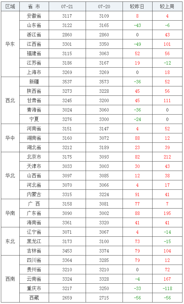 豆粕均价(饲料原料)21-31名:山东省3122元/吨、安徽省3117元/吨、福建省3115元/吨、山西省3097元/吨、广东省3090元/吨、辽宁省3071元/吨、河北省3070元/吨、天津市3033元/吨、青海省3024元/吨、浙江省2860元/吨、西藏自治区2659元/吨。