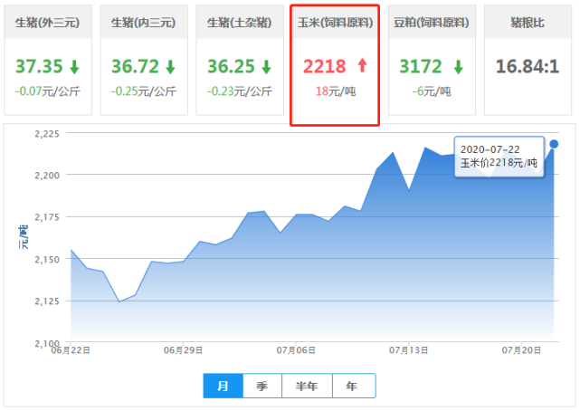 2020年07月22日(星期三),今日全国玉米均价为2218元/吨,报价较昨日(2020年07月20日2200元/吨)上涨了18元/吨,报价与上周(2020年07月15日2211元/吨)上涨了7元/吨,较上月(2020年06月22日2155元/吨)上涨了63元/吨!