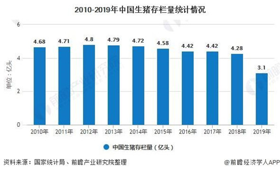 受环保政策和行业周期性和波动性因素的影响,我国生猪存栏量近年来呈下降趋势。2012年我国生猪存栏量有4.8亿头,至2019年下降至3.10亿头。