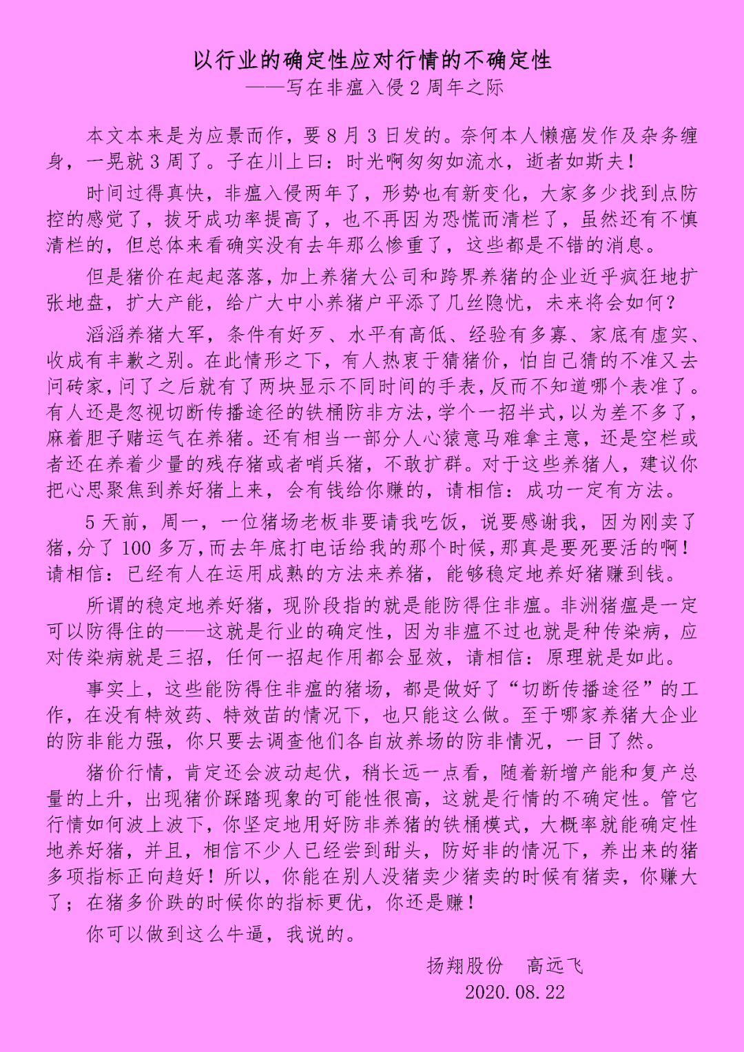 所谓的稳定养好猪,现阶段指的就是能防得住非瘟。非洲猪瘟是一定可以防得住的——这就是行业的确定性,因为非瘟不过也就是种传染病,应对传染病就是三招,任何一招起作用都会显效,请相信:原理就是如此。
