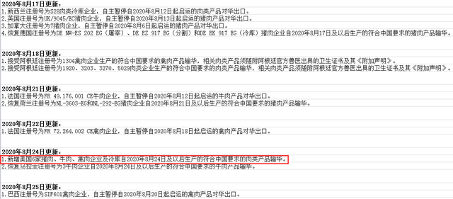 海关总署发布的《符合评估要求的国家或地区输华肉类产品名单》近期几乎每天都在变动,当然,其中有暂停进口的,也有恢复进口的。根据8月25日发布的《符合评估要求的国家或地区输华肉类产品名单》,8月17日-8月25日,新西兰、英国、加拿大、法国、巴西等国多家企业自主暂停相关肉类产品对华出口,同时,德国、阿根廷、荷兰、乌拉圭等国多家企业相关肉类产品恢复出口,此外,还新增了美国6家肉类企业产品输华。