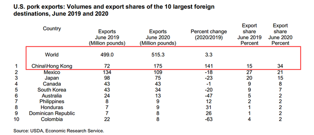 今年以来,我国新增美国肉类企业产品输华名单增长近千家,其中,仅3月17日,就新增美国447家猪肉企业、438家牛肉企业、58家禽肉企业自2020年3月17日及以后生产的符合中国要求的禽肉产品输华,而暂停的不过个位数。根据美国农业部的数据,今年6月,美国猪肉出口量5.15亿磅,同比增长3.3%,中国已经成为其最主要的出口国,6月份出口至中国的猪肉达到1.75亿磅,同比增长141%,占其出口比例则从去年的15%快速提升至34%,而其他主要的出口国墨西哥、日本、加拿大、韩国、澳大利亚等出口量均出现明显的回落,原因可能是新冠疫情的影响。