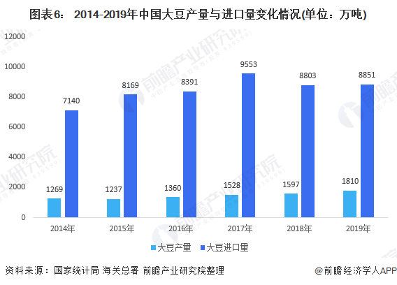 大豆是我国猪饲料最主要的原料,但我国大豆对于进口及其依赖,从2014-2019年中国大豆产量与进口量的变化情况来看,每年我国都需要进口约国内大豆产量4倍以上的大豆来满足国内市场的需求。