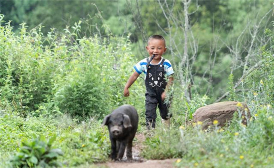 四川省昭觉县三河村养猪创业者郑吃合3岁的儿子在山里追赶一只乌金猪 李梦馨 摄