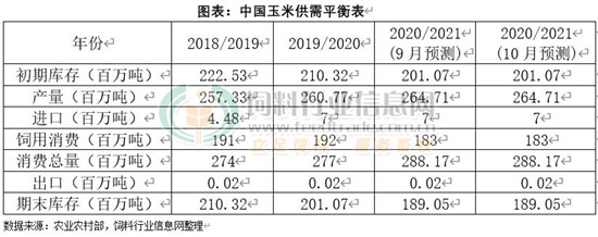 美国农业部(USDA)公布的10月供需报告显示,中国2020/21年度玉米产量预估为2.6亿吨,中国2020/21年度玉米进口预估为700万吨,中国2020/21年度玉米出口预估为2万吨。