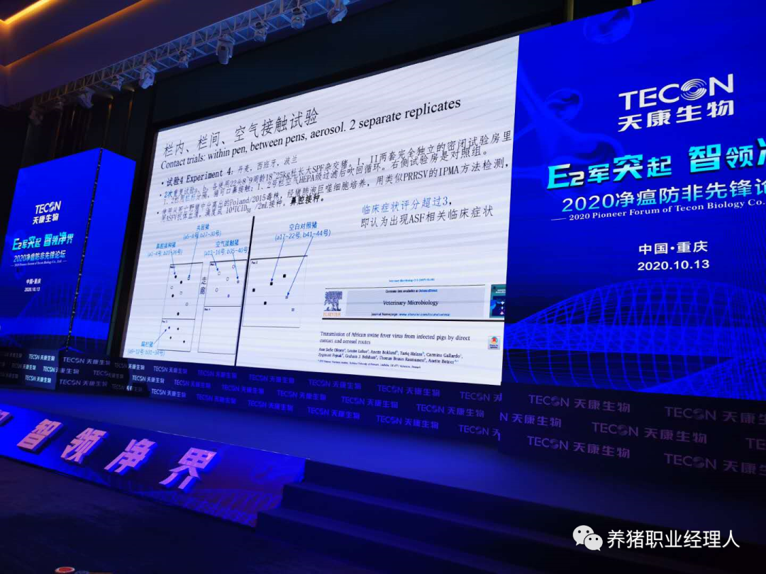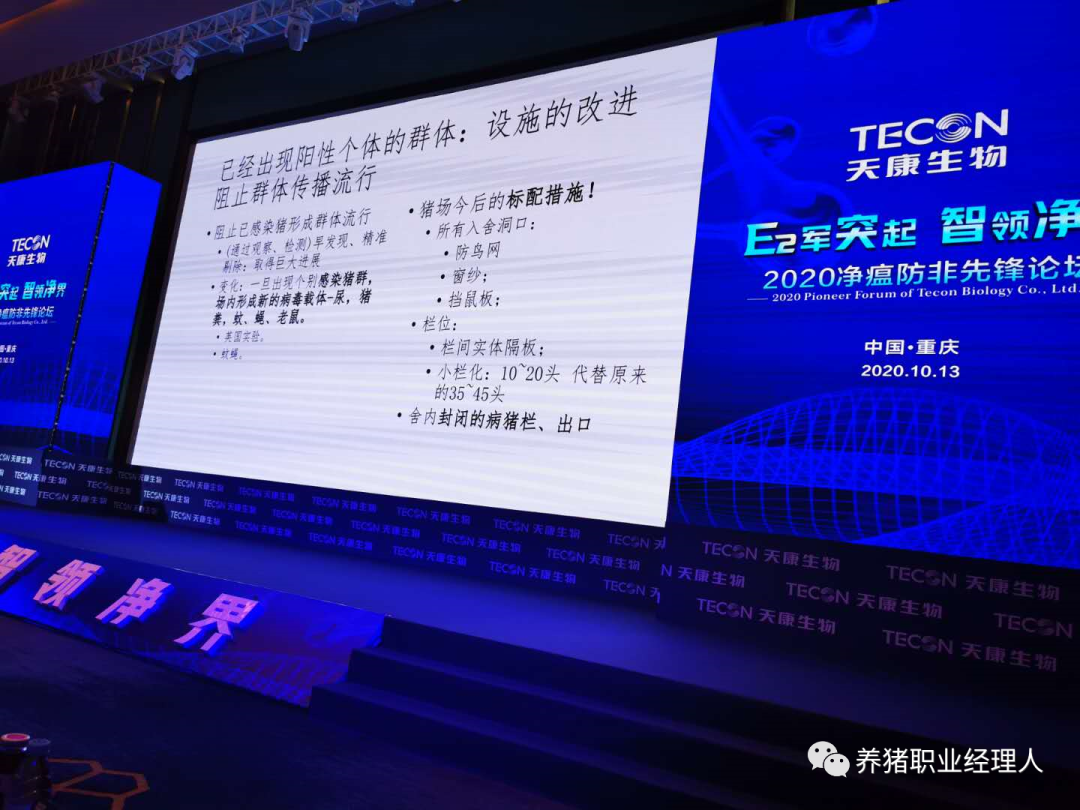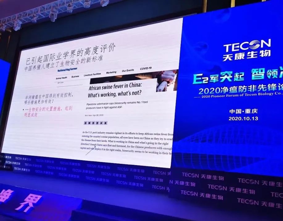 2020年10月13日下午,在重庆渝北区重庆金陵大饭店三楼会议厅由天康生物举办的《2020净瘟防非先锋论坛》上,闫之春博士就规模养殖企业成功防控非洲猪瘟作了一场精彩而生动的报告。