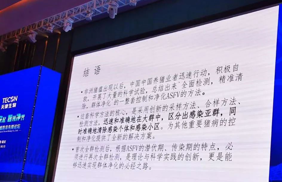 在大规模生产条件下,中国从业者创造性地使用、完善的“全群检测,精准清除,群内净化”控制非洲猪瘟的成功,是史无前例的创举。