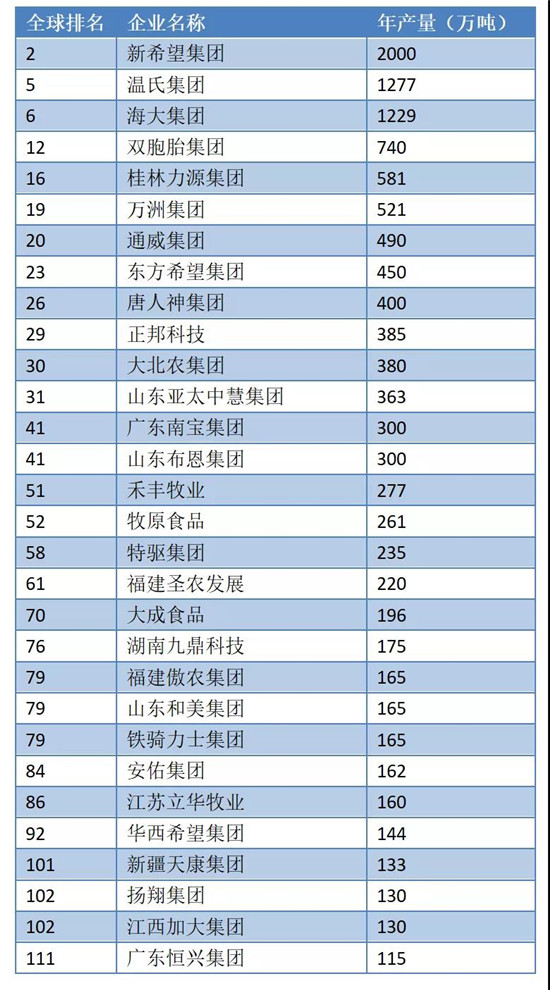 具体企业中,正大、新希望、嘉吉连续两年稳居前三。新上榜的中国企业中最令人瞩目的是桂林力源集团,年产量581万吨的力源一上榜就排名全球16,中国第5。不过对于行业人来说,力源早就是耳熟能详的横跨饲料、养殖、粮油的大集团,只不过可能由于力源向来低调,直到今年才终于被WATT纳入统计范围。