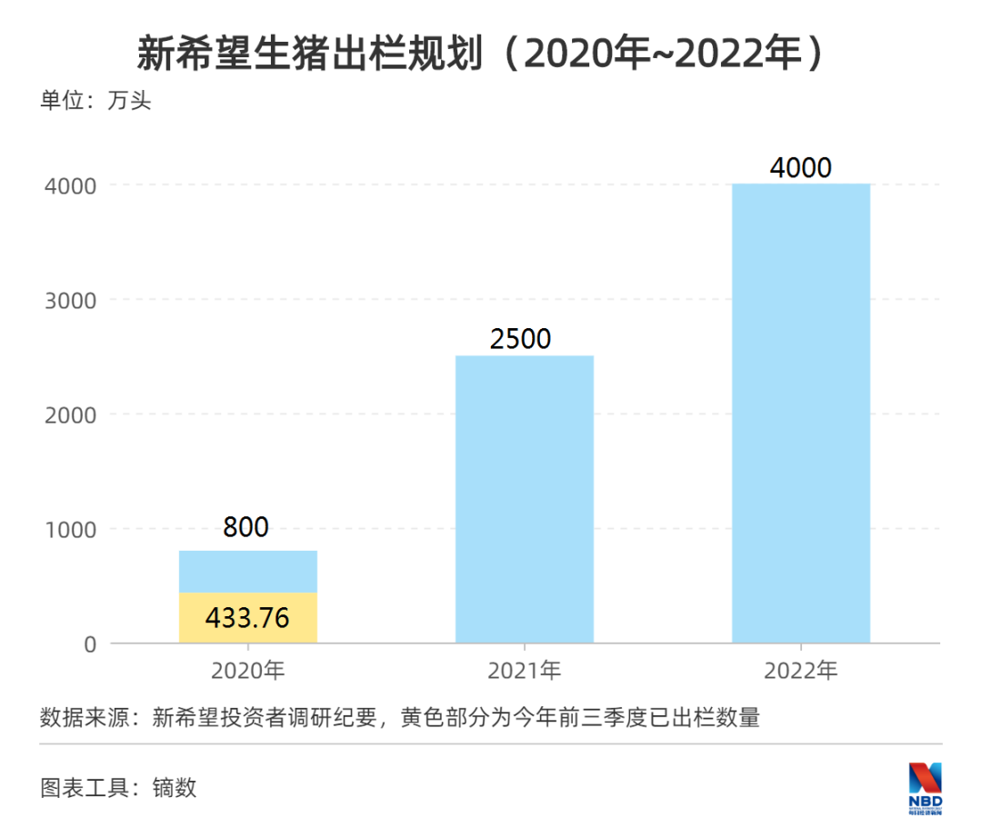 而按照新希望的生猪出栏规划:2021年确保2500万头出栏,挑战3000万头出栏目标,2022年确保出栏4000万头。今年前9个月,新希望生猪出栏量为433.76万头。对于全年出栏800万头的目标,新希望方面曾多次表态:“非常确定可以实现”。