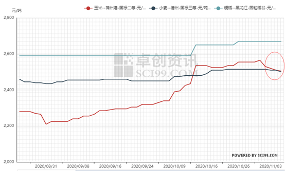 从上图我们可以看出,9月末以来三大主粮价格均呈上行趋势,这与国产大豆行情基本一致。以玉米为例,锦州港的集散价格由8月末的2210元/吨,一路涨至10月末的2565元/吨,涨幅16.06%。但在最近,小麦及玉米的价格纷纷触顶回落。玉米的价格回落主因上货量的增加,小麦及稻谷的行情主要受到了陈粮供应的影响。