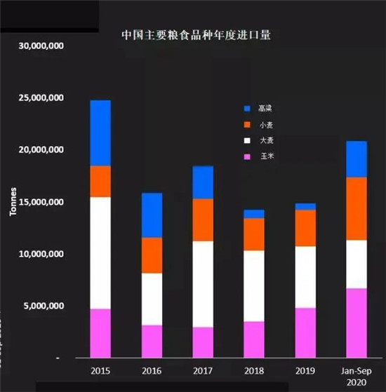 中国海关数据显示,2020年前九个月,中国的大麦、玉米、高粱和小麦进口量同比增加83.3%至2,086万吨,而且预计粮食进口还将创出更多纪录。