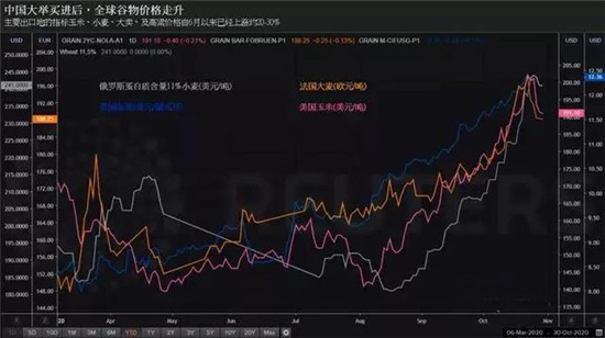 分析师和交易商表示,中国采购以及其他主要谷物生产国自身的问题帮助抬高了全球玉米、小麦和大麦价格--而且有可能在未来几个月把影响传导至仰赖谷物的乳制品和肉类行业。