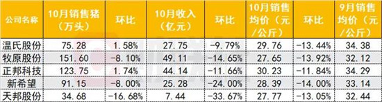 上市猪企最新的业绩数据也能反映这一趋势。相比9月销售均价,五大上市猪企10月生猪销售价格回落幅度从11%-14%不等。受此影响,五大上市猪企销售收入也纷纷下滑。其中,天邦股份下滑33.67%,幅度最大。新希望紧随其后,下滑24%。牧原股份、正邦科技、温氏股份分别环比下降14.65%、11.66%、9.79%。