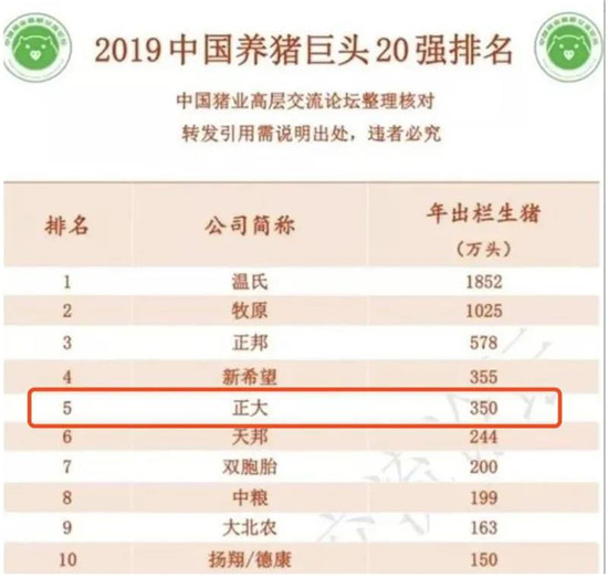 有统计数据显示,2019年出栏量第一的温氏为1852万头,牧原出栏1025万头,正大出栏约350万头,规模在国内排在第五。
