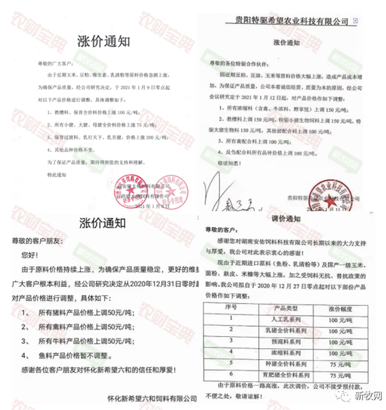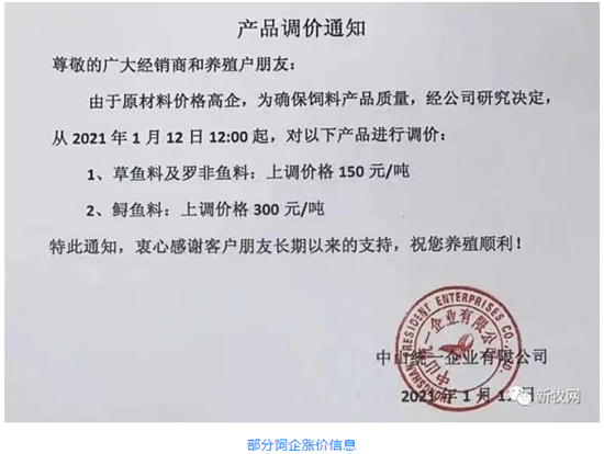 近期,多家饲料企业纷纷宣布涨价,新希望、正大、海大、通威、特驱、安佑等饲企陆续宣布涨价,涉及猪料、禽料、鱼料等多个品种,涨幅达50-300元/吨,其中鲟鱼料上调价格最高,为300元/吨。猪料中,江西猪太傅饲料有限公司保育过渡料价格上调200元/吨。饲料掀起开年第一轮涨价潮,与原料价格上涨息息相关。