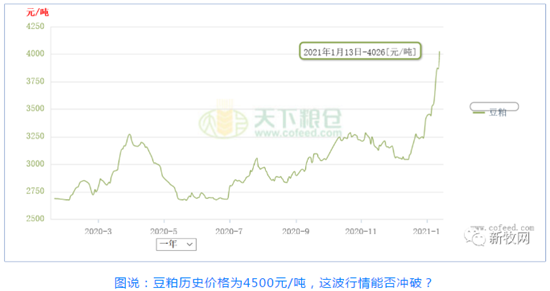 2021年首月还未过半,饲料涨价再度霸屏朋友圈,算上去年饲料涨价已达11轮。而在今天(1月14日),豆粕已涨破4000元/吨,黑龙江豆粕报价更是高达4350元/吨,同期,玉米价格也站上3000元/吨高位。两大原料较去年涨幅均超50%,可谓历史罕见,已影响到畜禽的口粮问题。原料价格如此疯涨背后,究竟是何原因?一起来关注。