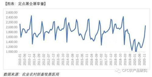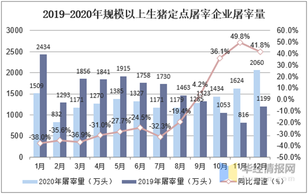 2020年12月全国规模以上生猪定点屠宰企业屠宰量(生猪出栏)仅比2018年12月少10%
