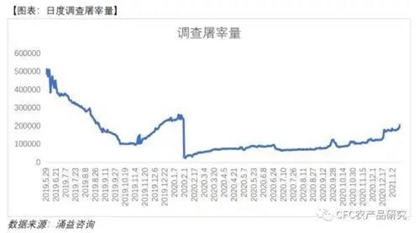 答案自然是否定的。同样作为屠宰数据,另一家机构的日度调查屠宰量在数据表现上有明显的不同。从整体趋势上看,屠宰量逐步上升的事实比较确定,但数量的差距明显。