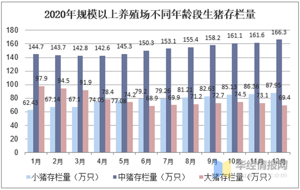 而从不同生长阶段的生猪存栏情况来看,2020年12月如果按照30—60斤小猪,70—180斤中猪,180—250大猪的体重划分的话,基本上大猪对应1个月左右的出栏量,中猪对应2个月左右的出栏量,小猪对应4个月左右的出栏量。而国内的小猪存栏量自2020年3月以来呈现出不断增长的态势,中猪存栏量在4月以来稳步提升。从目前来看小猪存栏占比26.81%,中猪存栏占比51.64%,大猪存栏占比21.55%,从当前占比结构中未来集中出栏的时间是中猪存栏对应的2021年2月的集中出栏。