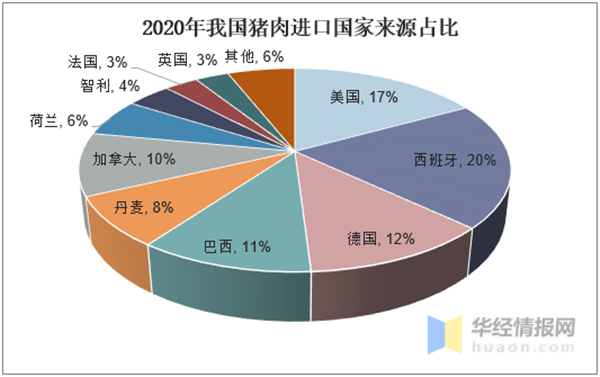 由于国内的非洲猪瘟疫情造成了国内猪肉供需的较大缺口,因此2019年我国进口了210.8万吨猪肉以平抑国内猪肉价格。2020年全国各地依然零散性爆发疫情,爆发的主要途径大多与进口冷链有关,一方面人们增加对进口冷鲜肉类的消费担忧,另一方面国家加大对进口冷链食品及其外包装新冠肺炎病毒核酸检测要求和抽检力度,这不仅延缓了整个进口的速度,国家还对检查出带有新冠疫情冻肉品的外企及时停止了进口。目前国内进口猪肉主要来自美国、西班牙、德国、巴西,分别占进口猪肉数量的17%、20%、12%、11%。