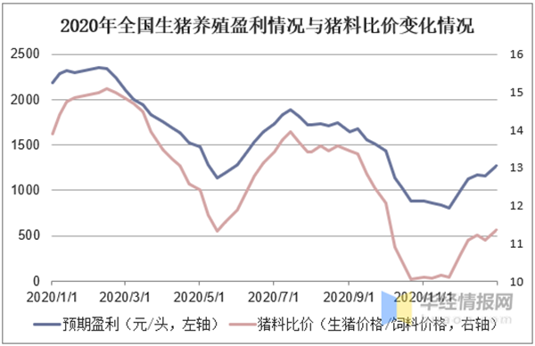 受益于较高的猪肉价格,2020年生猪养殖业的盈利情况优于行业历史平均水平。一般生猪的养殖利润由养殖收入以及养殖成本两个因素决定,其中养殖成本的构成主要有饲料成本以及仔猪成本,还包括人工成本及疫苗兽药,管理成本,除污成本,折旧成本等,所占比例较小且变动幅度较小,而饲料成本占到整个养殖成本区间的50%以上,因此饲料价格对于养殖户利润有直接影响。猪料比价是指生猪价格与饲料价格的比值,是衡量生猪养殖饲料成本情况的重要指标,从2020年的情况来看,猪料比价与生猪的盈利情况呈现出高度拟合,进入2020年下半年以来由于养殖户大规模补栏导致市场饲料需求量明显增长,生猪饲料价格上升,一定程度上影响了生猪养殖的盈利空间。2020年12月末,全国平均猪料比价为11.35,而猪料比价的平衡点为7.61,在年末消费量增加的背景下,预计短期内猪价或窄幅调整为主。