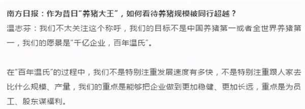 近期,温氏股份董事长温志芬接受了南方日报记者的专访,在回应记者提出的“作为昔日“养猪大王”,如何看待养猪规模被同行超越?”的问题上,温志芬表示,温氏的目标不是中国养猪第一或者全世界养猪第一,不是特别注重发展速度有多快,比规模、产量,而是能够把企业做到更加稳健、更加长远,重点是为员工、股东谋福利。