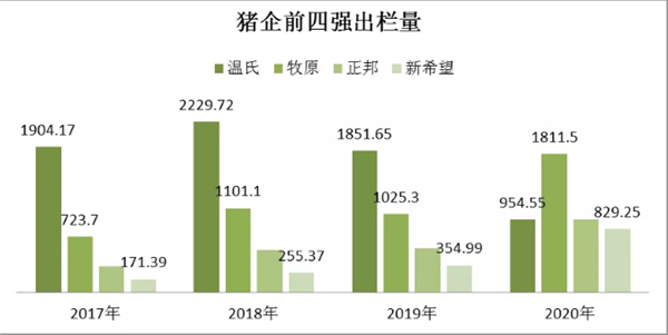 2020年,牧原生猪出栏量大幅增长,快速超越温氏,全年出栏量达到1811.5万头,已达到温氏的1.9倍,而正邦也凭借12月份的出栏增量,最终以1.5万头的优势超过温氏,成为国内年度出栏量第二的猪企。温氏从上年的第一一下退居第三,但如果从月度出栏量来看,2020年9月开始,新希望的月度出栏量已经超过温氏,下半年的出栏量总和也已经远超温氏。