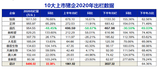 从10大上市猪企2020年出栏数据来看,上半年过半猪企出栏量仍低于去年同期,而下半年则快速转正,甚至翻番增长,产量进入快速增长通道。温氏是唯一一家全年出栏量同比下跌的企业,更是唯一一家下半年出栏量不及上半年出栏量的猪企,这也说明,公司的生猪复产、扩产进程已经落后于友商。