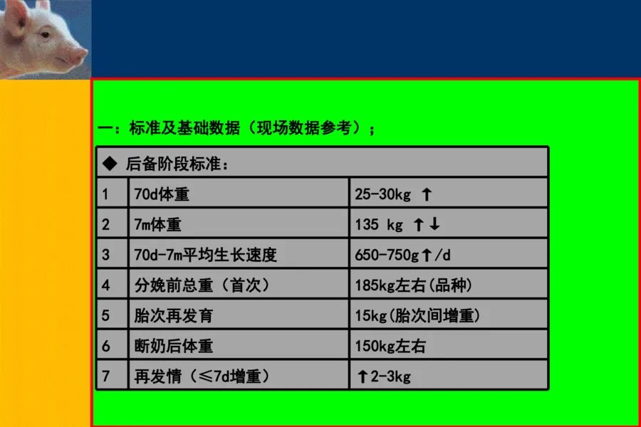 70日龄体重,25~30公斤;配种体重,135公斤;70天至配种期间增重速度650~750克每天为宜;分娩前第一胎母猪总重185公斤(品种间可能稍有差异)胎次间增重15公斤;断奶后一胎母猪体重150公斤左右,这样可以确保再发情天数少于7天达到最大比例。
