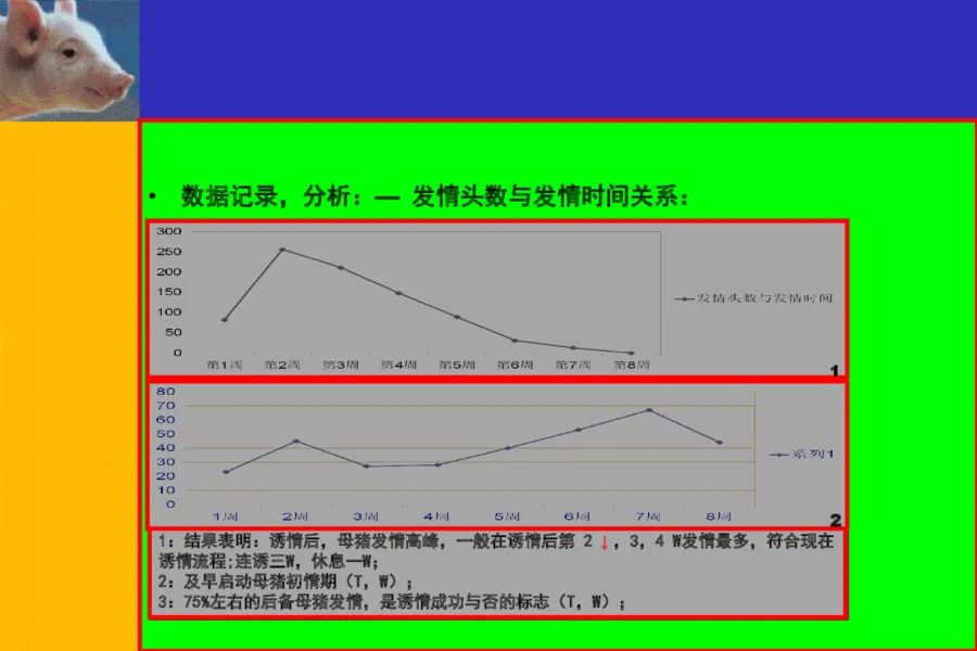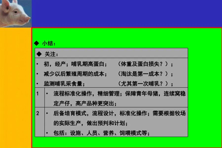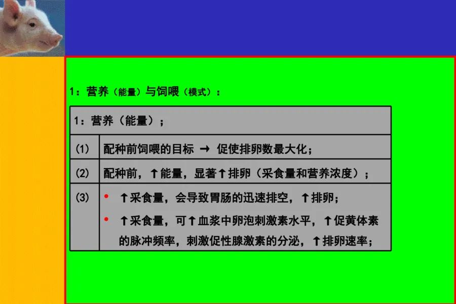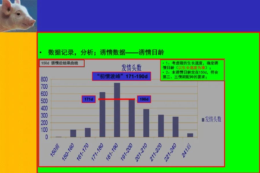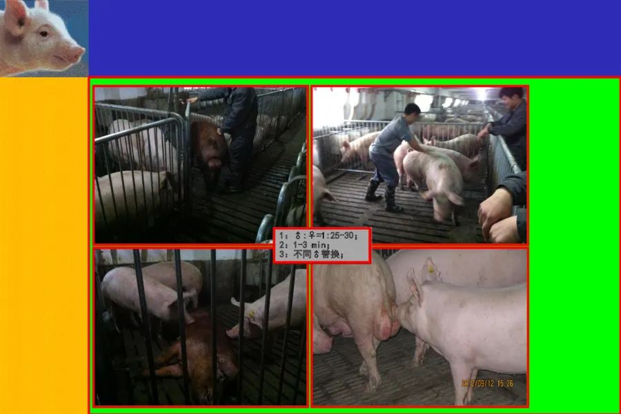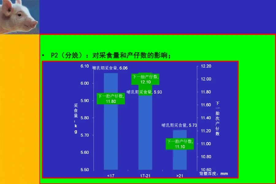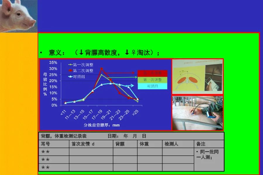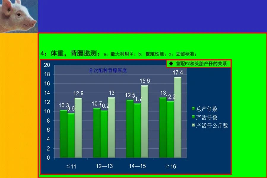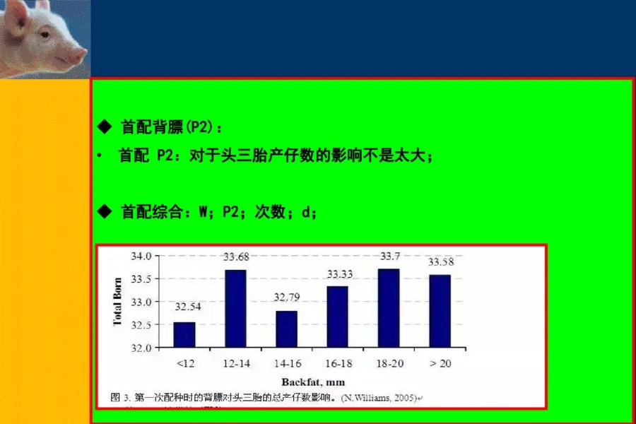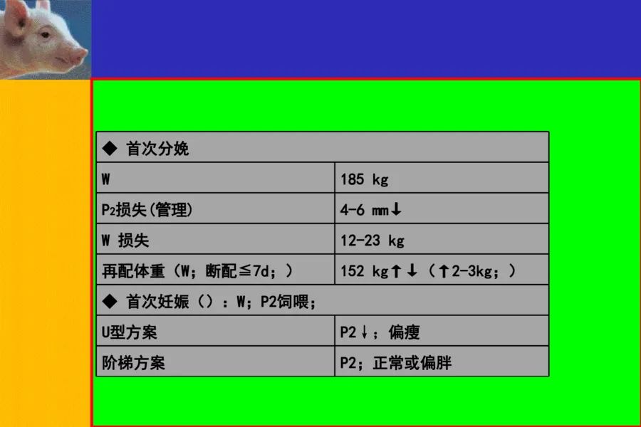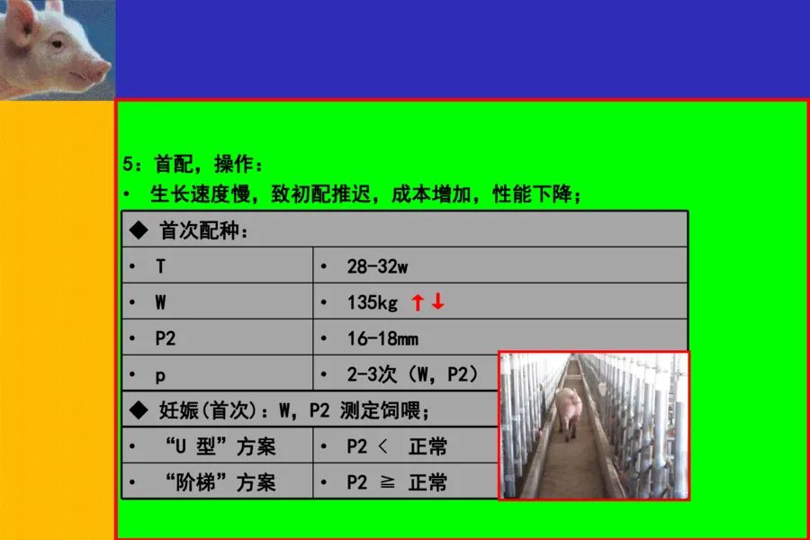 分娩标准体重在185公斤;第一次哺乳期间P2点膘厚降低4~6mm常见,体损失在12~23公斤。断奶后再配体重152公斤左右,如果母猪偏瘦执行U形方案(中间少两头多);如果母猪正常执行阶梯方案(步步高)。