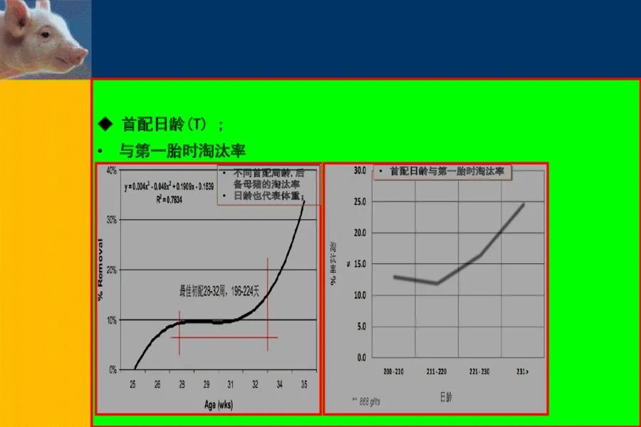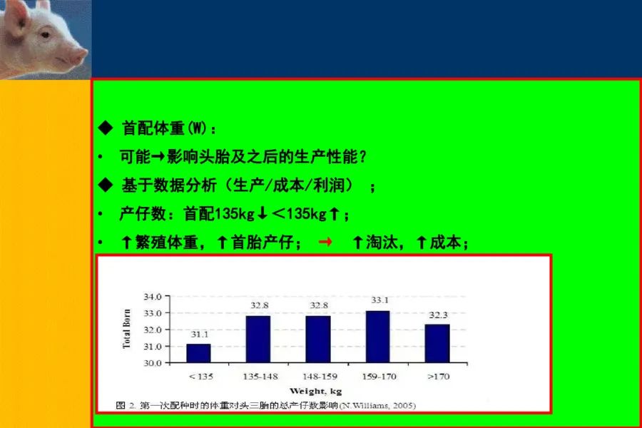 首配的体重可能影响头胎及之后的生产性能,这是基于大数据的分析,产仔数方面如果小于135公斤就配会下降,而达到135公斤体重初配头胎产仔数会提高。在淘汰率方面,低于标准体重配种淘汰率会高些,母猪整体的寿命会缩短,如果超出标准体重太多初配也会带来母猪的基础消耗增加,成本增加的弊端,所以尽量往标准体重靠拢才是最佳的选择。