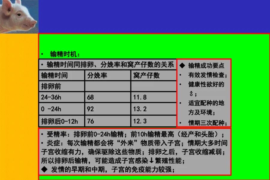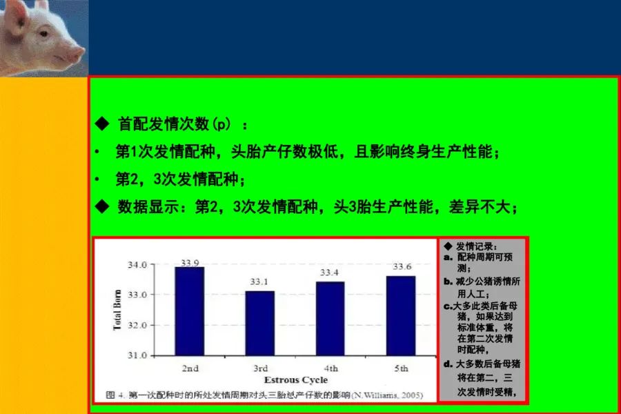 第一次发情配种,头胎产仔数极低,且影响终身生产性能;第2、3次发情配种上佳,数据显示,第2、3次发情配种,头3胎生产性能,差异不大。