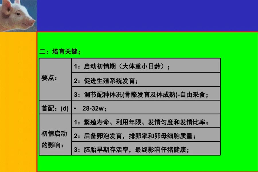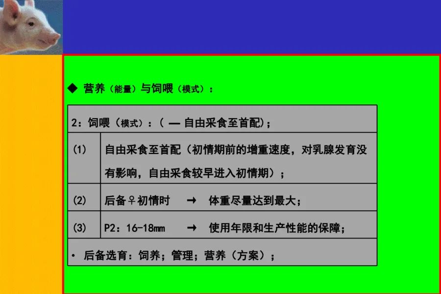 要点1、启动初情期最好是大体重小日龄2、促进生殖系统发育;3、调节配种体况(后备料注重骨骼发育及体成熟)-主张自由采食。