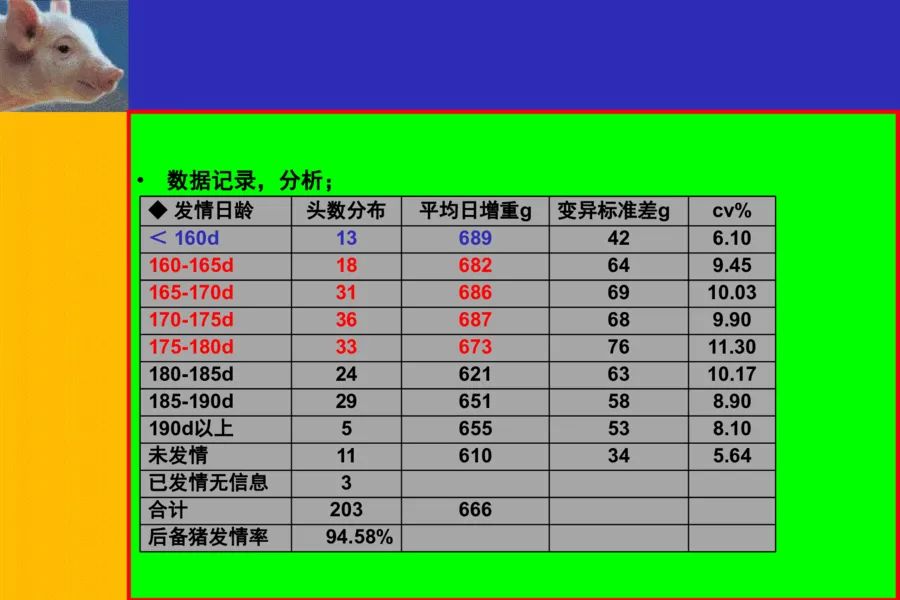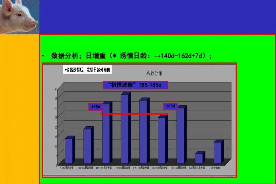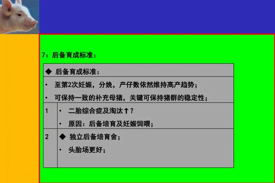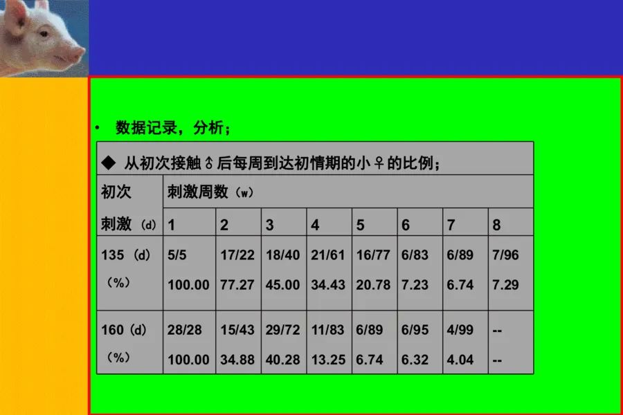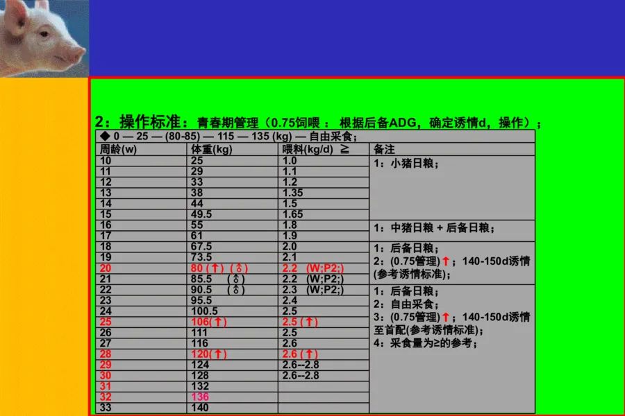体重135公斤,P2点膘厚16~18mm;周龄在28~32周,第2到第3个情期为佳,绝对不能是第一次发情就配种。所以后备母猪第一次发情日龄越早越有利配种时的选择(配或者不配有选择余地)。