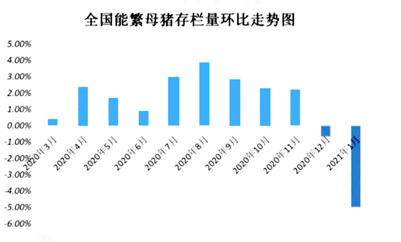 据行业机构监控显示,进入2020年12月份以及2021年1月份,母猪存栏环比呈现明显下行的态势,其中,2021年1月份,母猪存栏量环比下降达到了4.99%!而1月份母猪存栏的产能也将直接影响2021年11月份市场生猪出栏的规模,直接抑制猪价下行的步伐,也将对2021年11月猪价进一步支撑!