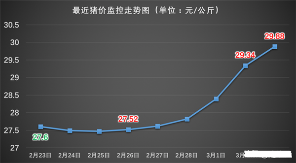 二、生猪价格直奔15元大关。生猪市场在2、3月之交处开始走强,猪价从2月26日开始,到3月3日连续6天时间快速拉升,猪价由每公斤27.52元上涨到29.88元,目前距离每斤15元的猪价只有6分钱之差。