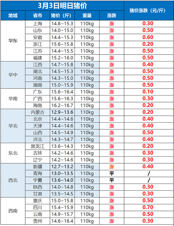 3月3日猪价显示,全国30个省市区中只有青海和宁夏保持稳定,其余28省全部上涨,涨幅主要集中在0.3-0.7元之间,其中四川上涨0.7元,猪价15.4-15.9元/斤;安徽上涨0.6元,猪价14.4-15.3元/斤;山东、江苏、福建、湖南、湖北、河南、山西、重庆、云南等9个省市上涨0.5元,其他省份上涨0.1-0.4元不等,各地具体情况请见附表: