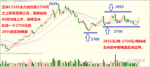 玉米主力合约在2750元/吨上方再次反弹,拉动中短期均线围绕60日线上下缠绕,印证了2855元-2750元/吨的横盘区间正在形成。由于没有能够有效突破2750元/吨,而是选择向上突破2800元说明玉米进入高位盘整趋势的确立,第一压力位就是2855元,第二压力位则是2929元/吨。交易者需要密切关注2855附近的反应,如果突破则有望向上调整2900元上方。